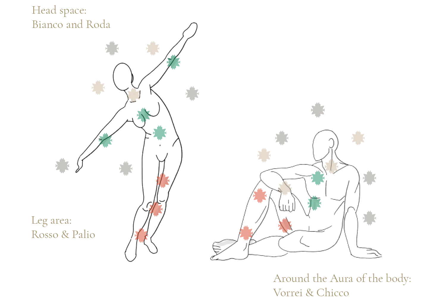 Bianco a Roda prý nejlépe vyniknou v horní části těla (hlava pyramidy) v aplikaci na krk či do vlasů. Splendido či Verde jsou určeny pro střed těla (srdce pyramidy). Rosso a Palio pak na spodní část těla, oblast nohou či podkolenních jamek (základ pyramidy). Každou kolekci – Classic i Atelier – pak doplňuje ještě tzv. “aurová” vůně, kterou je doporučeno nastříkat kolem těla – Vorrei a Chicco.